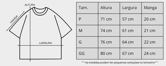 Essas medidas são úteis para ajudar na escolha do tamanho adequado da camiseta de acordo com suas preferências de ajuste.
